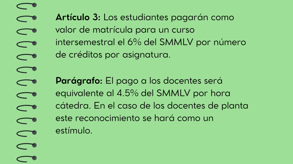 - Acuerdo del Consejo Superior No. 16 del 5 de mayo de 2015 por medio del cual se aprueban los costos de los cursos intersemestrales diferenciados, cuyo valor del crédito está diferenciado según el estrato socioeconómico del estudiante y basado en SMMLV.