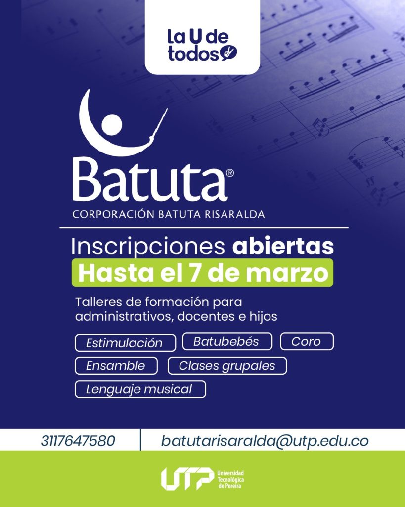 El programa Batuta en la Universidad Tecnológica de Pereira se desarrolla como una alianza orientada al fortalecimiento de la Política de Bienestar Institucional, utilizando la música como herramienta de formación integral. A través de procesos de estimulación y lenguaje musical, este espacio promueve el desarrollo cognitivo, emocional y social de los estudiantes, fomentando la sensibilidad artística, el trabajo en equipo y el bienestar. Batuta UTP se consolida como una estrategia formativa que integra el arte a la vida universitaria, aportando al crecimiento personal y a la construcción de comunidad dentro del campus.