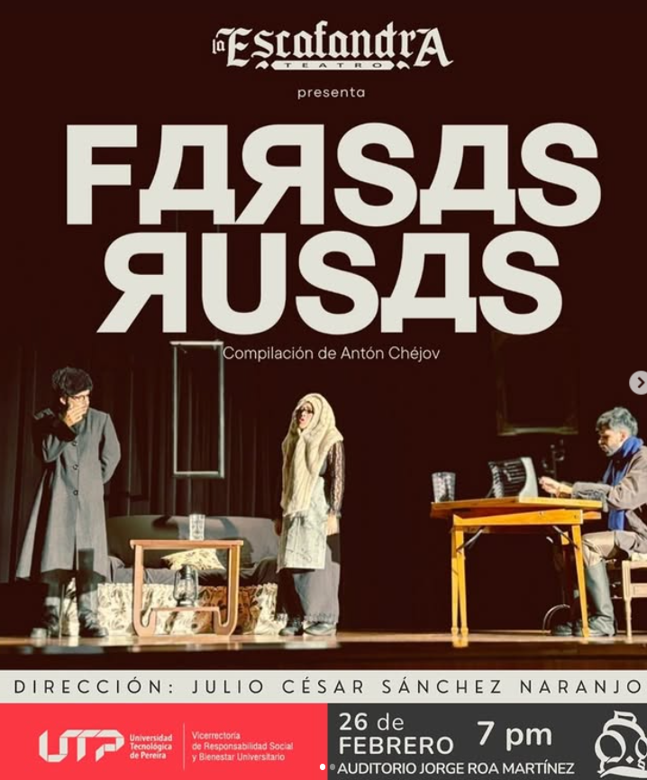 En el marco de los Jueves del Teatro en la U.T.P., programa cultural permanente apoyado por la Vicerrectoría de Responsabilidad Social y Bienestar Universitario, el grupo La Escafandra Teatro presenta Farsas Rusas, compilación de 3 obras cortas del inmortal escritor ruso Antón Chéjov.
