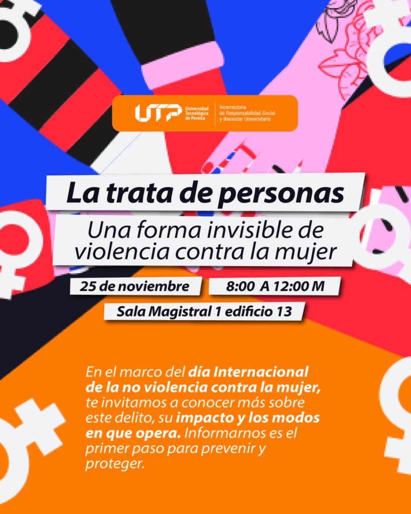 En el marco del Día Internacional de la No Violencia contra la Mujer, la Universidad Tecnológica de Pereira desarrollará una jornada formativa enfocada en visibilizar la trata de personas, un delito que vulnera principalmente a mujeres y permanece oculto en la sociedad.