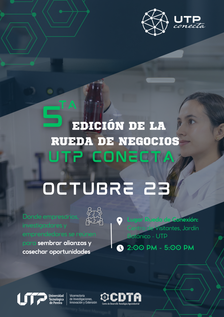 La Vicerrectoría de investigaciones, Innovación y Extensión de la Universidad Tecnológica de Pereira, tiene el gusto de anunciar la 5ta edición de la rueda de negocios UTP Conecta, un evento diseñado para fortalecer vínculos y abrir nuevas oportunidades de relacionamiento que nos permitan aunar esfuerzos como actores de desarrollo de nuestro Departamento.