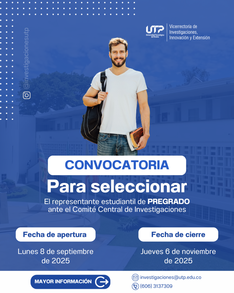 - La presente convocatoria tiene como fin dar cumplimiento a lo establecido en el Acuerdo del Consejo Superior Universitario No 028 del 03 de agosto de 2016 por medio del cual se actualiza la normatividad vigente sobre fomento a la investigación en la Universidad Tecnológica de Pereira y se adoptan otras disposiciones, en el cual en su capítulo III y en su artículo 9, establece que del comité hará parte: “Un representante de los estudiantes de pregrado que pertenezca a un grupo de investigación o semillero de investigación y que cuente al menos con una publicación.”
