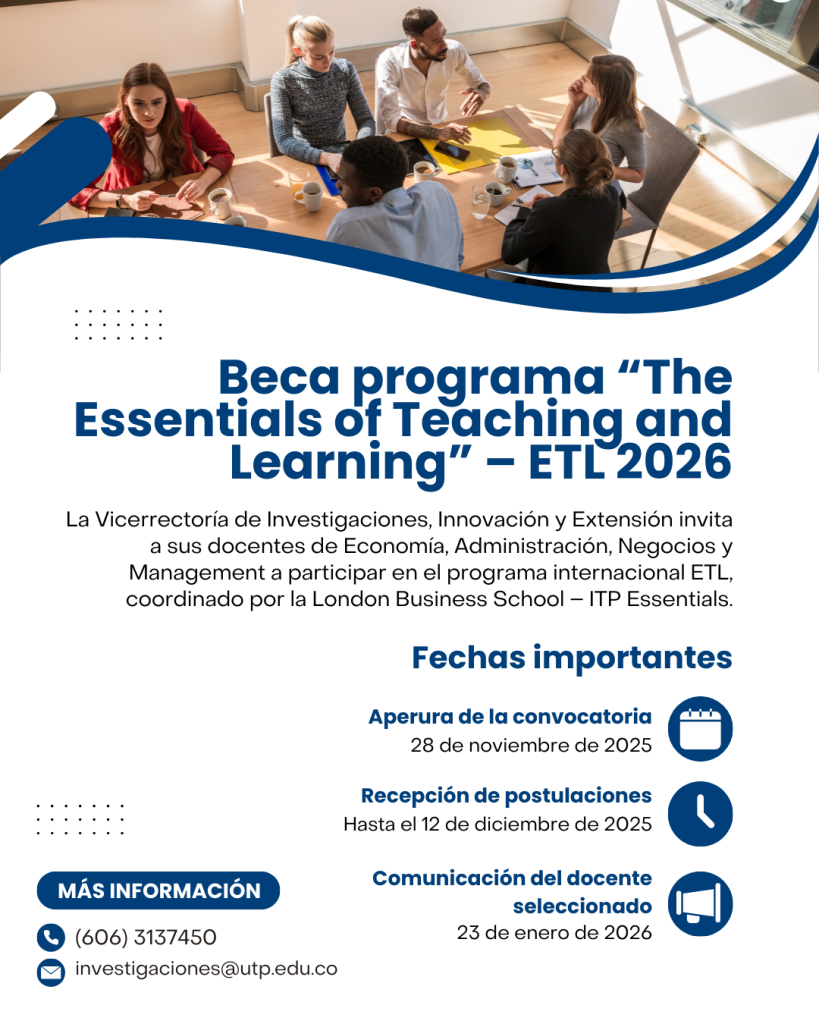 Seleccionar un(a) docente de la Universidad Tecnológica de Pereira (UTP) que represente a la institución en la 3ra edición del programa internacional virtual “The Essentials of Teaching and Learning (ETL)”, coordinado por la London Business School – ITP Essentials y Columbus Brokers.