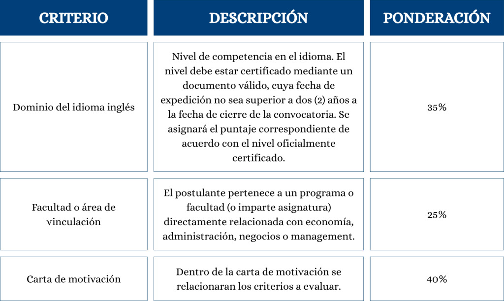 2. Docentes vinculados a programas y facultades del ámbito de Economía, Administración, Negocios, Management o áreas afines (finanzas, contaduría, marketing, logística, emprendimiento, etc.). También podrán participar aquellos profesores de cualquier otra facultad o departamento de la universidad que actualmente imparten asignaturas, módulos o cursos directamente relacionados con las temáticas de economía, administración y negocios.