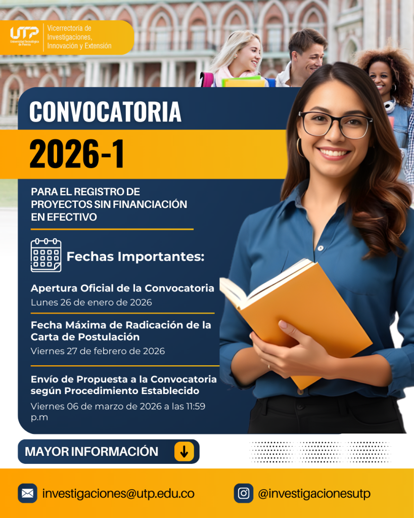 - Radicar carta de presentación a la convocatoria (Ver Anexo 1) al correo electrónico ventanillaunica@utp.edu.co, dirigida a la Vicerrectoría de Investigaciones, Innovación y Extensión, antes del27 de febrero de 2026 a las 11:59 a.m. (UTC-5), destacando que deberá contar con radicado con fecha máxima del 27 de febrero de 2026.