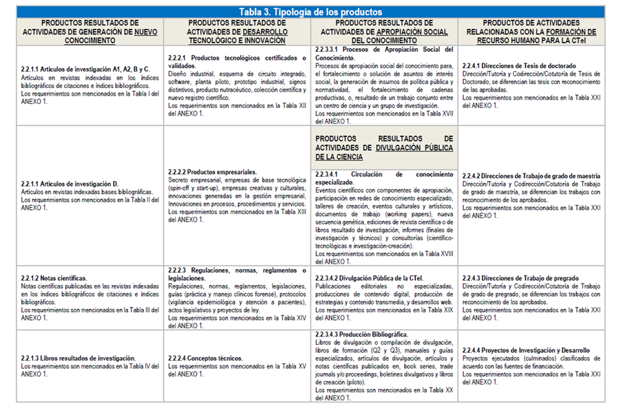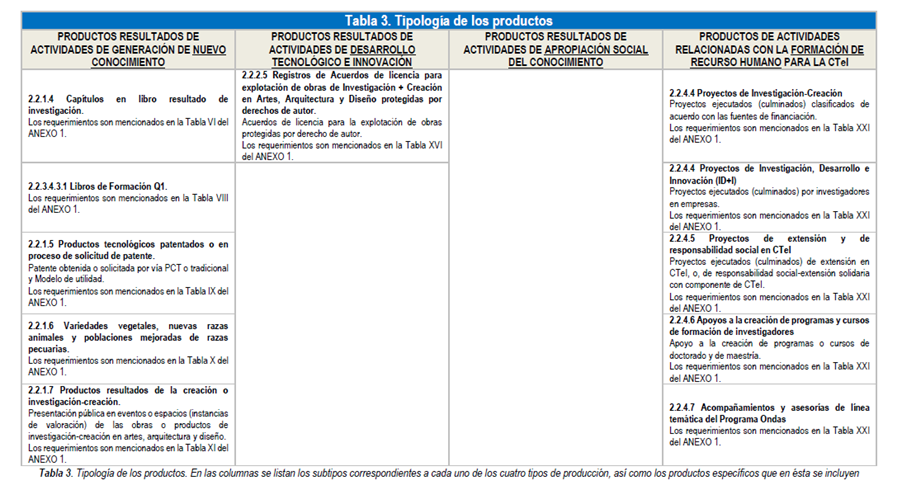 Cuadro 001 – Tipología de productos según MinCiencias