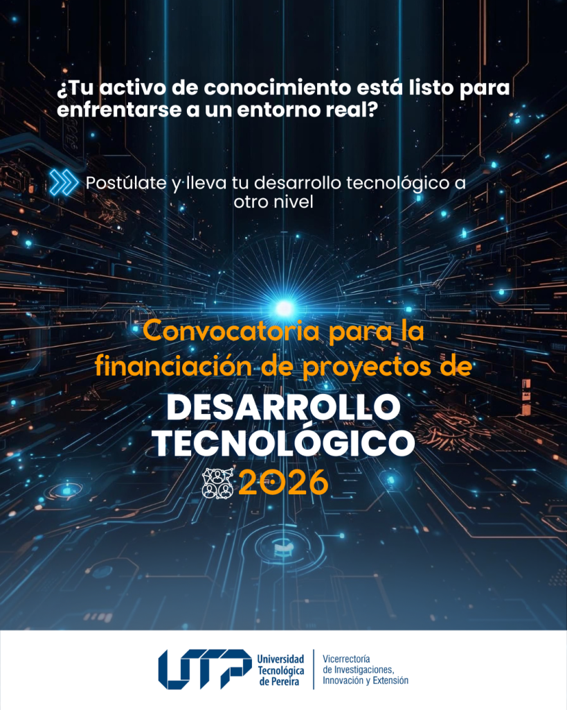 La Universidad Tecnológica de Pereira, en cumplimiento de su Plan de Desarrollo Institucional 2020 – 2028, específicamente en el pilar de Creación, Gestión y Transferencia del Conocimiento, habilita una convocatoria para financiar la maduración tecnológica de activos de conocimiento derivados de proyectos de I+D+i, caracterizados con Índice de Madurez Tecnológica (nivel de TRL, por sus siglas en inglés) entre 4 y 6.