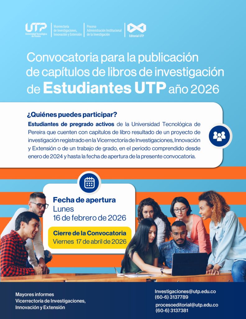 La Vicerrectoría de Investigaciones, Innovación y Extensión de la Universidad Tecnológica de Pereira invita a participar en la convocatoria para la publicación de capítulos de libro de investigación de estudiantes de pregrado, cumpliendo los siguientes términos: