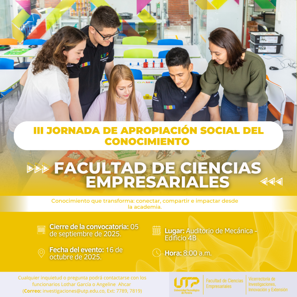 - Grupos de Investigación: Los docentes, egresados y estudiantes vinculados a los grupos de investigación de la Universidad Tecnológica de Pereira podrán participar en la jornada con: